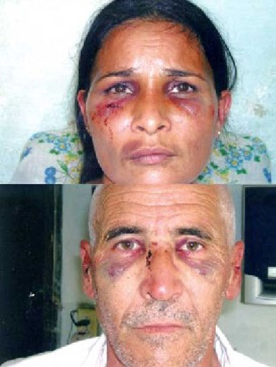 El 10 de octubre pasado, en la provincia de Villa Clara, las turbas del partido comunista, organizadas por la policía política, atacaron al matrimonio de Orestes Suárez Torres (53 años) y su esposa Nancy González García (39), quienes trataban de dirigirse a una reunión de Bibliotecarios Independientes convocada por la economista Martha Beatriz Roque, ex presa política. Estas fotos fueron tomadas una semana después de la golpiza, en la que participaron expertos en artes marciales, pero todavía son visibles los hematomas en el rostro de las víctimas. También fueron severamente golpeados en el abdomen.