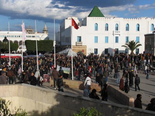 La manifestación -se nos dice- se ha desplazado a la Qasba, a la plaza delante de la sede del Primer Ministro, y hacia allí nos dirigimos atravesando La Medina, extrañamente relajada sin la presencia de turistas. Es lógico ir a la Qasba: es ahí donde hay que hacer ahora la presión. En ese gran cajón formado por el ministerio de Finanzas, el Ayuntamiento, el Palacio de Justicia y el Primer Ministerio, algunos miles de personas hacen hervir sus carteles y sus banderas. Son ya las 14 h. y la multitud insiste, resiste, no se cansa: “Seguiremos luchando hasta derribar el gobierno”. Cuando el griterío o la espesura parecen aflojar, un nuevo grupo se incorpora desde detrás del hospital, con nuevas consignas y nuevos refuerzos; y luego otro desde el corazón de La Medina. Racimos de jóvenes cuelgan de las ventanas del primer ministro.