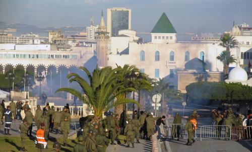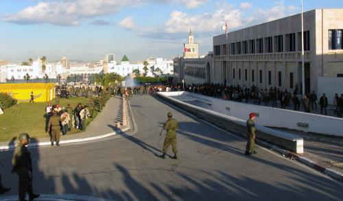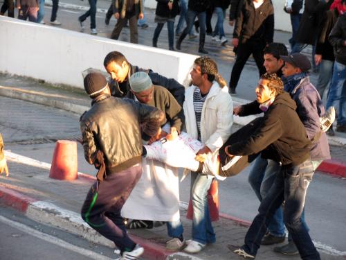 Durante algunos minutos, allí abajo, apenas a doscientos metros, se prolonga una batalla desigual. Vuelan las bombas lacrimógenas y se oyen insultos e impactos de piedra. Fugitivos pasan en medio de los soldados, que se abren a su paso y se unen a nosotros. Dos heridos, muy cerca de donde nos encontramos, son trasladados en parihuelas de brazos a las tiendas de la protección civil. La Qasba se vacía muy rápidamente.