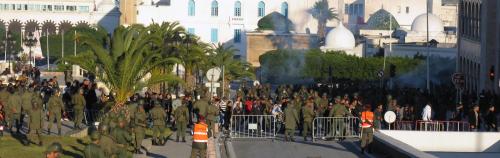El centro de la ciudad sigue en revolución. Todos los días se renuevan las protestas y todos los días se producen pequeños cambios. Hoy las concentraciones comienzan de nuevo en la Avenida Bourguiba, donde a las 10 de la mañana, frente al ministerio del interior, hay ya en torno a dos mil personas. El gobierno, entre otras medidas tomadas a modo de placebo, ha decretado tres días de luto por los “mártires” que el propio gobierno mató y las banderas ondean en los edificios a media asta. Un cartel enarbolado por los manifestantes dice: “Ningún luto antes de que el gobierno caiga”. Se grita, se canta, se reclama la disolución del gabinete. La policía entra desde la plaza 7 de Noviembre y tiende un nutrido cordón de escudos y cascos para cortar la calzada en dirección a Mohamed V. Un grupo de manifestantes que irrumpe con gritos y cánticos desde el extremo opuesto empuja sin saberlo y por un momento el choque parece inevitable. Pero la disciplina por ambas partes es muy grande y, tras apoyarse un instante sobre el muro de uniformes negros, la multitud se gira y comienza a caminar hacia la Medina, sin dejar de gritar y cantar el himno nacional.
