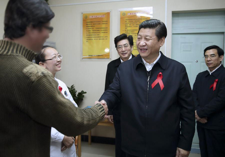 Imagen de archivo tomada en noviembre de 2012 de Xi Jinping (c), estrechando la mano de un portador del Virus de Inmunodeficiencia Humana (VIH), mientras participa en las actividades del Día Mundial del Síndrome de Inmuno Deficiencia Adquirida (SIDA), en el distrito de Fengtai, de Beijing, capital de China.