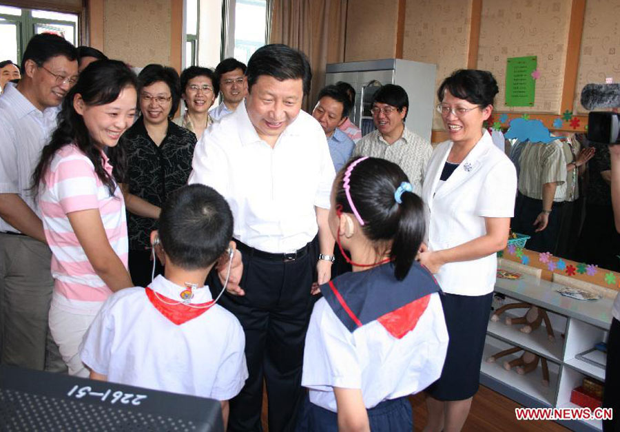 Imagen de archivo tomada en septiembre de 2007 de Xi Jinping (c), en ese entonces secretario del Comité Municipal de Shanghai del Partido Comunista de China (PCCh), hablando con estudiantes con problemas de audición, en la Escuela Qiyin en el distrito Minhang, en Shanghai, al este de China.
