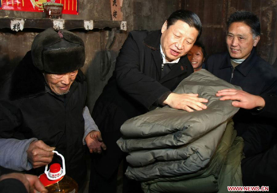 Imagen de archivo tomada en enero de 2008 de Xi Jinping (c), visitando al aldeano Tang Zhaowei, del grupo étnico Dong, quien sufriera pérdidas por las tormentas de nieve y hielo en la aldea de Laoshankou, en el municipio de Gaolouping, de la provincia de Guizhou, al sureste de China.