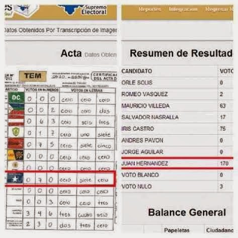 Después de las elecciones del 24 de noviembre, y cuando habían sido escrutados el 88 por ciento de los sufragios, el TSE declaró ganador a Juan Hernández, del gobernante Partido Nacional (PN), con el 36,56 por ciento.