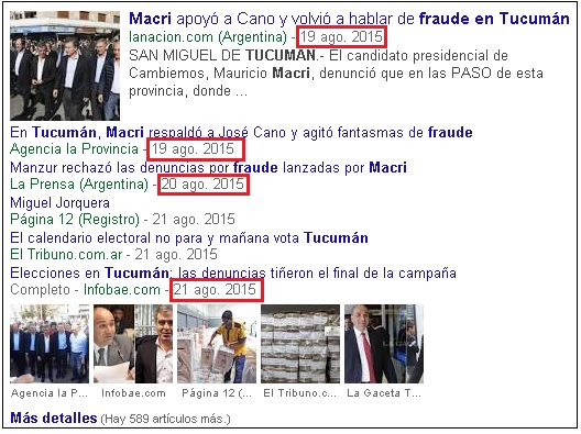 Aquí abajo tenemos una captura de pantalla "macri + fraude" que arroja estos resultados a la cabeza con las fechas resaltadas en rojo: