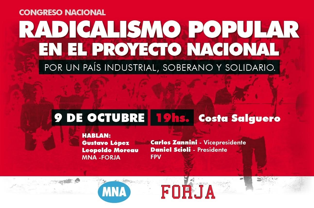 Por eso, este viernes 9 de octubre se realizará en Costa Salguero, en el Pabellón 6, el Congreso Nacional del Radicalismo Popular dando nacimiento al MNA-Forja y lo coronaremos a las 19 hs. con un acto en el que hablarán, además de los dirigentes del nuevo espacio, Leopoldo Moreau y Gustavo López, nuestros candidatos a la Presidencia y Vice-Presidencia de la Nación, Daniel Scioli y Carlos Zannini.