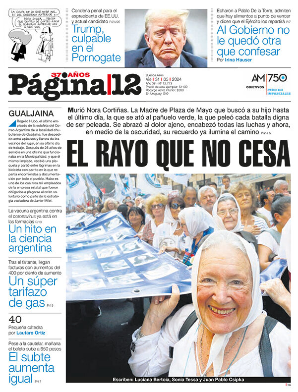 Referente de los derechos humanos, santa pagana de todas las luchas, Norita estuvo hasta principios de este mes en Plaza de Mayo —ese lugar que transitaba desde mayo de 1977—. Nunca supo qué hizo la dictadura con su hijo Carlos Gustavo Cortiñas.
