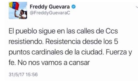 El pasado 1 de junio el diputado opositor del ala más radical, Freddy Guevara, escribió en su cuenta de Twitter que sus seguidores continuarían sus protestas en "los cinco puntos cardinales".