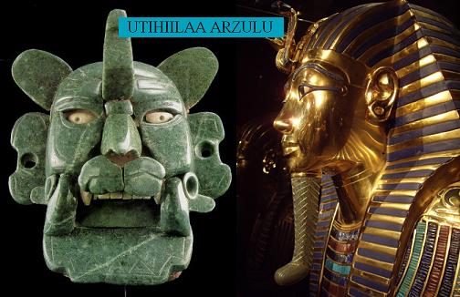 Este perfil Maya (abajo,izquierda) denota rasgos característicos de los faraones en especial a Tutankhamon, incluso tiene en su frente el ave que junto una serpiente ostenta el faraón, otra peculiaridad notable es la barbilla, que sin duda remonta al antiguo Egipto.