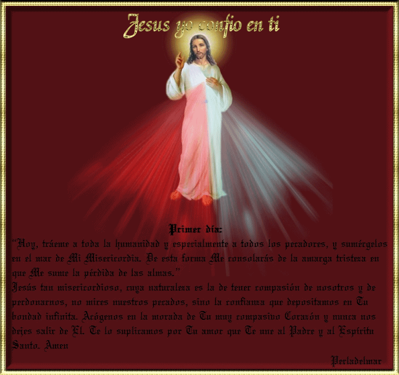 “Deseo que durante esos nueve días lleves a las almas a la Fuente de mi Misericordia para que saquen fuerzas, alivio y toda gracia que necesiten para afrontar las dificultades de la vida y especialmente en la hora de la muerte. Cada día traerás a Mi Corazón a un grupo diferente de almas y las sumergirás en este mar de Mi Misericordia. Y a todas estas almas Yo las introduciré en la casa de mi Padre. Lo harás en esta vida y en la vida futura. Y no rehusare nada a ningún alma que traerás a la Fuente de Mi Misericordia. Cada día pedirás a Mi Padre las gracias para estas almas por Mi amarga Pasión.”
