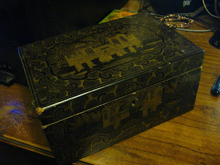 Esta es una caja de té de mi abuela, lacada, de madera, donde se guardan sus cartas y postales.