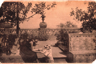 En la foto, con dieciséis o diecisiete años, con el perro "Huacho", en el cerro Santa Lucía. Mis primeros años transcurrieron entre el barrio Lastarria, la tercera cuadra de Vicuña Mackenna y la primera de Bustamente. O sea, el Santa Lucía, el Forestal, el parque Balmaceda ex Gran Bretaña y ex Japonés, hasta el parque Bustamante, cuyos árboles ví crecer.