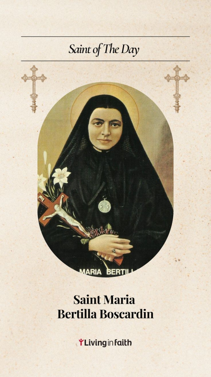 Operata di tumore a 22 anni, lei che è infermiera sperimenta la vita in ospedale anche sul versante della sofferenza. Riesce a rimettersi e torna alle sue fatiche: quelle che ha scelto entrando nel 1905 tra le Suore Maestre di Santa Dorotea, Figlie dei SS. Cuori a Vicenza. Al battesimo è stata chiamata Anna Francesca: figlia di agricoltori non certo ricchi, ha frequentato alcune classi di scuola elementare; poi, presto al lavoro, come tutte le ragazze della sua condizione all’epoca. Lavoro in campagna, in casa sua, in casa d’altri. Presa la decisione di farsi suora, Anna Francesca lascia che sia il suo parroco a scegliere per lei tra le varie congregazioni femminili. Al momento della professione religiosa prende poi i nomi di Maria Bertilla. I suoi primi compiti in comunità sono i lavori in cucina, al forno e in lavanderia: nessun problema per una che conosce le fatiche della campagna ancora senza macchine, dove tutto si fa a forza di braccia. Poi inizia il tirocinio presso l’ospedale di Treviso e si rimette a studiare, diplomandosi infermiera. Ma questo non le impedisce di dedicarsi anche a compiti più pesanti per aiutare le consorelle. Ecco poi sopraggiungere il tumore, l’intervento chirurgico, la lenta ripresa. Pochi anni dopo scoppia la prima guerra mondiale, e quando Treviso viene a trovarsi in pericolo suor Maria Bertilla è trasferita in Lombardia con tutto l’ospedale, e sottoposta a una prova severa: incomprensioni e dissensi provocano la sua “retrocessione” da infermiera a donna di fatica in lavanderia. Suor Maria Bertilla ne soffre moltissimo: ma dentro di sé, soltanto dentro. Non le sfugge una parola di amarezza, di risentimento. Il suo fisico ora resiste meno allo sforzo, ma la volontà non cede. Dopo il rientro a Treviso, la religiosa viene reintegrata nelle funzioni di infermiera. Ma lei è anche qualcosa d’altro, come dirà Giovanni XXIII canonizzandola l’11 maggio del 1961: "La irradiazione di suor Bertilla si allarga: nelle corsie, a contatto con gli epidemici, a consolare, a calmare: pronta e ordinata, esperta e silenziosa, fino a far dire anche ai distratti che Qualcuno – cioè il Signore – fosse sempre con lei a dirigerla". Finché crolla: si è riprodotto il tumore. "La morte mi può sorprendere ad ogni momento", scrive nei suoi appunti, "ma io devo essere preparata". Nuova operazione, ma questa volta non si rialza più e la sua vita si conclude a 34 anni. L’irradiazione però continua. Presso la sua tomba c’è sempre chi prega, chi ha bisogno della suora infermiera per i mali più diversi: e l’aiuto, per vie misteriose, arriva. Vissuta oscuramente, Maria Bertilla è sempre più conosciuta e amata da morta. Esperta in sofferenza e umiliazione, continua a donare speranza. Le sue spoglie si trovano ora a Vicenza, nella Casa Madre della sua comunità.