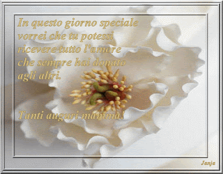 Grazie mamma perché mi hai dato la tenerezza delle tue carezze, il bacio della buona notte, il tuo sorriso premuroso, la dolce tua mano che mi dà sicurezza. Hai asciugato in segreto le mie lacrime, hai incoraggiato i miei passi, hai corretto i miei errori, hai protetto il mio cammino, hai educato il mio spirito, con saggezza e con amore mi hai introdotto alla vita. E mentre vegliavi con cura su di me trovavi il tempo per i mille lavori di casa. Tu non hai mai pensato di chiedere un grazie. Grazie mamma.