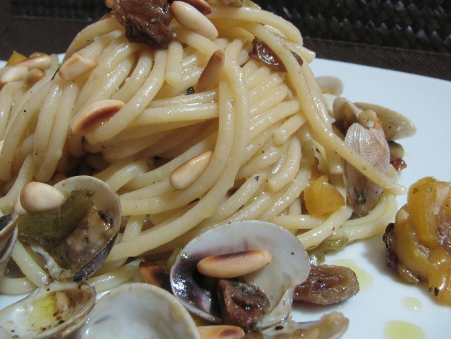 250 g di spaghetti 500 gr di vongole fresche 50 gr di pinoli 50 gr di uvetta sultanina 1 peperone giallo (tagliato a striscioline) prezzemolo 1 spicchio d'aglio 1 peperoncino 1/2 bicchiere di vino bianco secco olio extravergine d'oliva