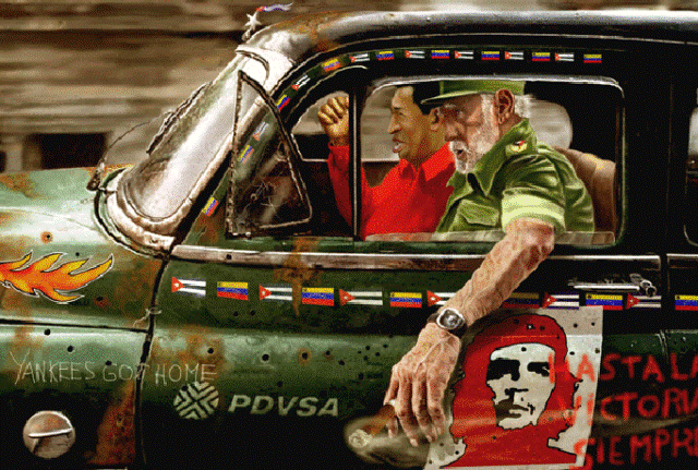 Y DIGO YO , CON CARIÑO: AMIGO VENEZOLANO, PUEBLO HERMANO, GENTE AMENA CUIDADO CON EL CUBANO DE LA BARBA Y LA GORRITA, QUE SI LO DEJAS, TE QUITA EL PETROLEO, EL GAS METANO, TODO EL HIERRO, LA BAUXITA, Y HASTA LA AREPA RELLENA. Y QUIERE PAGARTE LA MANO DE LO QUE SE LLEVA AHORITA, CON SOLO DISCURSOS EN CADENA, DE SU LACAYO VENEZOLANO ..