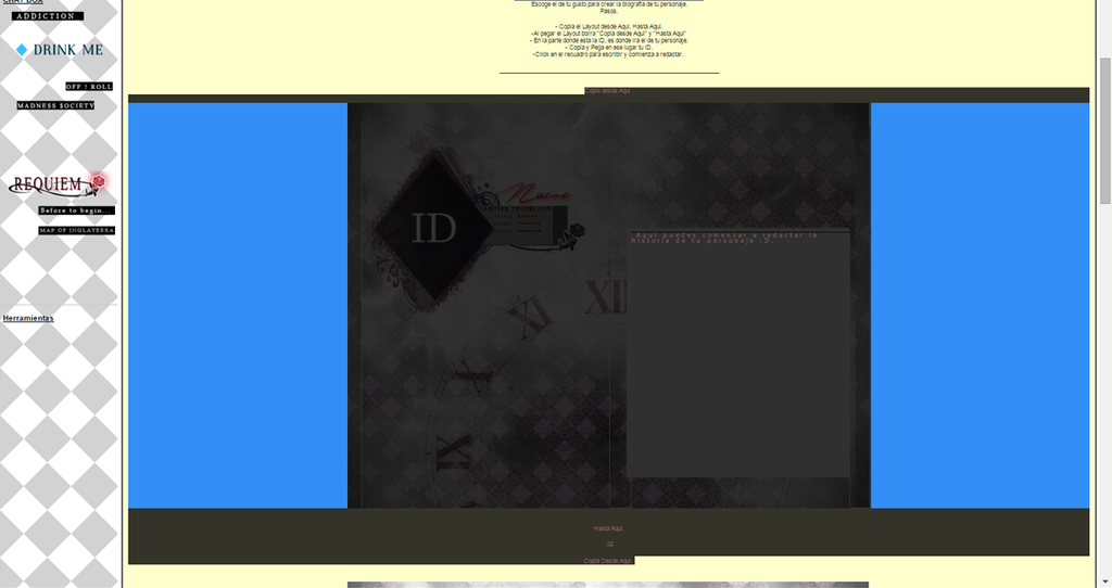 2- Recuerdenme como había que hacer para copiar las tablitas para los roles. Ya seee, jajaja, soy un fracaso, pero mi mente no suele retener cosas que puedo llegar a necesitar. Se que cuando roleabamos antes yo tenia que copiar los códigos, pegarlos y después modificarlos, pero eso era agotador la verdad, no hay un modo mas sencillo? Porque cuando seleccionaba las tablitas ya hechas desde un mensaje no se me copiaba para escribir directamente sobre ella U.U No se, yo de esas cosas no entiendo nada. Ya estoy pensando lo que me costara copiar el lay para los pjs T-T