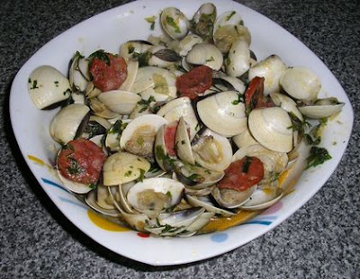 | Amêijoas de Cebolada Ingredientes: Preparação: Corte as cebolas e o alho francês às rodelas e pique os dentes de alho. Refogue-os no azeite e, quando alourarem, acrescente as amêijoas, a malagueta e o vinho. Tape o tacho e deixe cozinhar até as conchas abrirem. Tempere a gosto com sal e pimenta, polvilhe com a salsa picada e regue com o sumo de limão. Sirva de imediato. E nao esqueça que hoje é o Dia da Mae, faça-lhe uma surpresa, e sobretudo sorria, sorria sempre... Sao Percheiro | | |