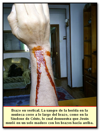 Y ahora os inserto estas dos fotos que me acabo de hacer de mi propio brazo, y que confirman de forma experimental lo que acabo de decir. He creado una imitación de sangre, con la misma consistencia que la sangre, y desde la muñeca he dejado correr la "sangre". En la primera foto el brazo está inclinado como si estuviera clavado en una cruz, ¡pero la "sangre" no corre a lo largo del brazo, sino que cae al suelo a un lado lado de la muñeca!