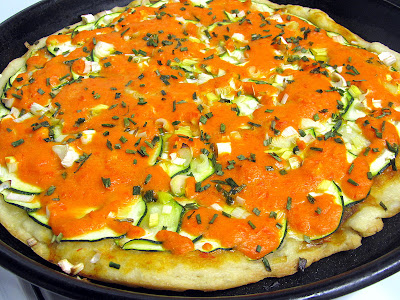 - Salsa: batir un pimiento rojo mediano con un buen chorro de nata vegetal, una cucharadita de té colmada de maicena y un chorro de ketchup. Hervir hasta espesar y echar sobre la pizza.