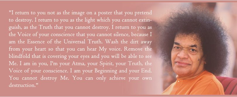 "I return to you not as the image on a poster that you pretend to destroy. I return to you as the light which you cannot extinguish, as the truth that you cannot destroy. I return to you as the voice of your conscience that you cannot silence, because I am the essence of the universal truth. Wash the dirt away from your heart so that you can hear my voice. Remove the blindfold that is covering your eyes and you will be able to see Me. I am in you, I'm your Atma, your spirit, your truth, the voice of your conscience. I am your beginning and your end. You cannot destroy Me. You can only achieve your own destruction." The poster was replaced with this message and all the students read it in silence and walked away.