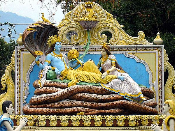 There was water everywhere. Lord Vishnu manifested himself in his great form and slept on the water.