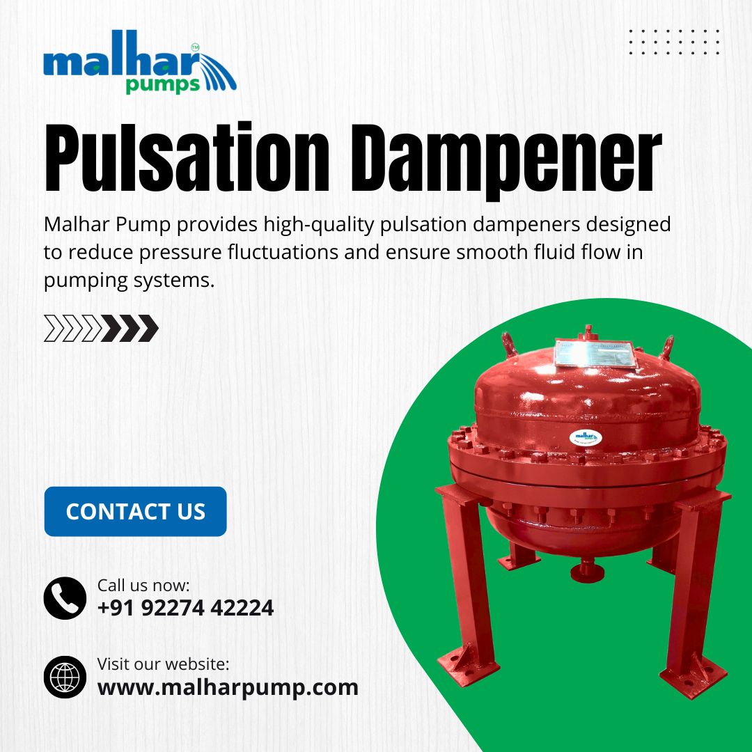 Malhar Pump provides high-quality pulsation dampeners designed to reduce pressure fluctuations and ensure smooth fluid flow in pumping systems. Our pulsation dampeners improve efficiency, extend equipment life, and maintain system stability in industrial applications. Built with precision engineering and durable materials, Malhar Pump’s solutions guarantee reliability and performance. Choose our pulsation dampeners for consistent results in demanding environments.