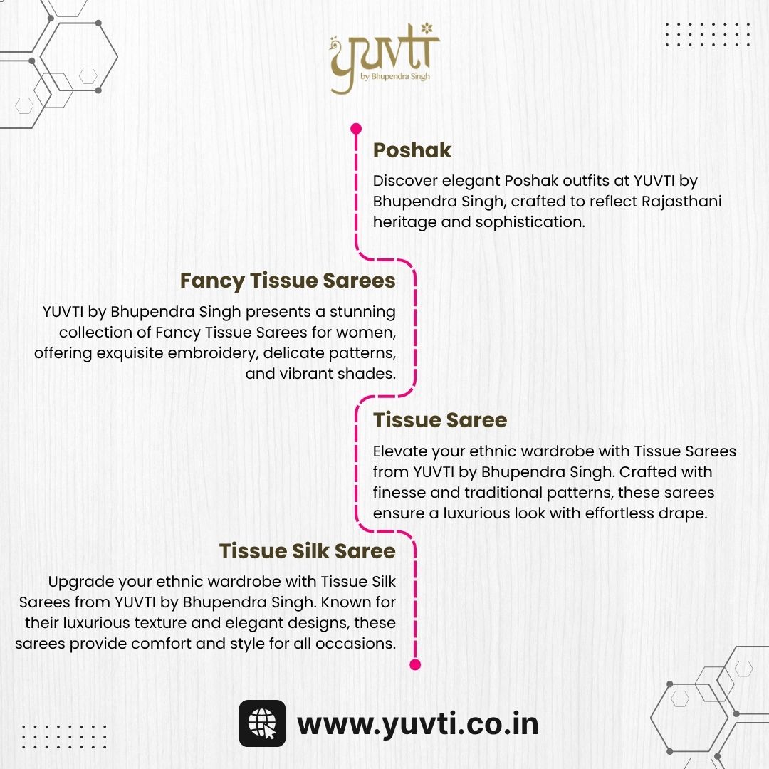 Elevate your ethnic wardrobe with Tissue Sarees from YUVTI by Bhupendra Singh. Crafted with finesse and traditional patterns, these sarees ensure a luxurious look with effortless drape. Ideal for festive events, parties, and casual gatherings, our collection provides vibrant colors and premium quality fabrics that bring charm, sophistication, and elegance to your everyday and special occasions.