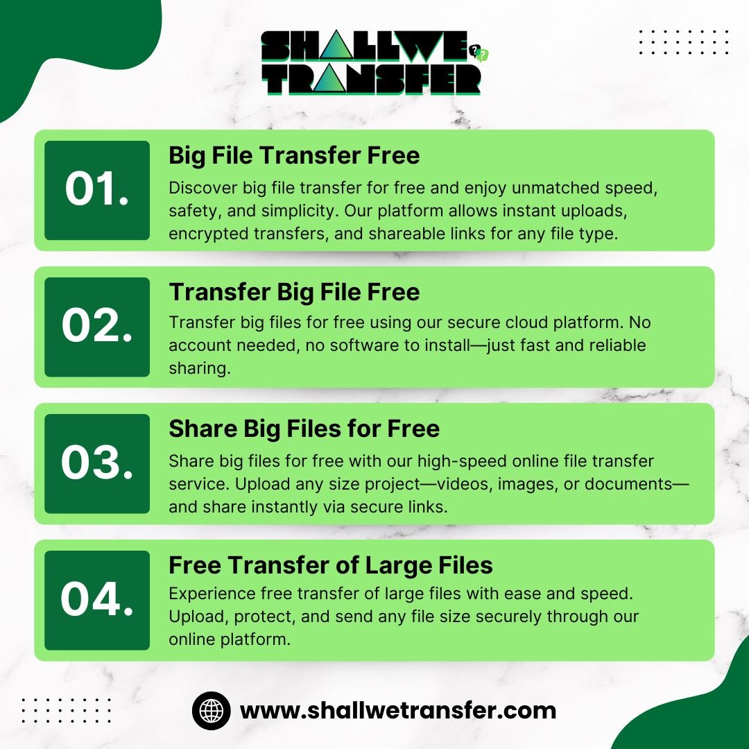 Share big files for free with our high-speed online file transfer service. Upload any size project—videos, images, or documents—and share instantly via secure links. Protect your data with built-in encryption and ensure recipients can download with ease. Ideal for businesses, creators, and individuals who value convenience, privacy, and seamless collaboration.