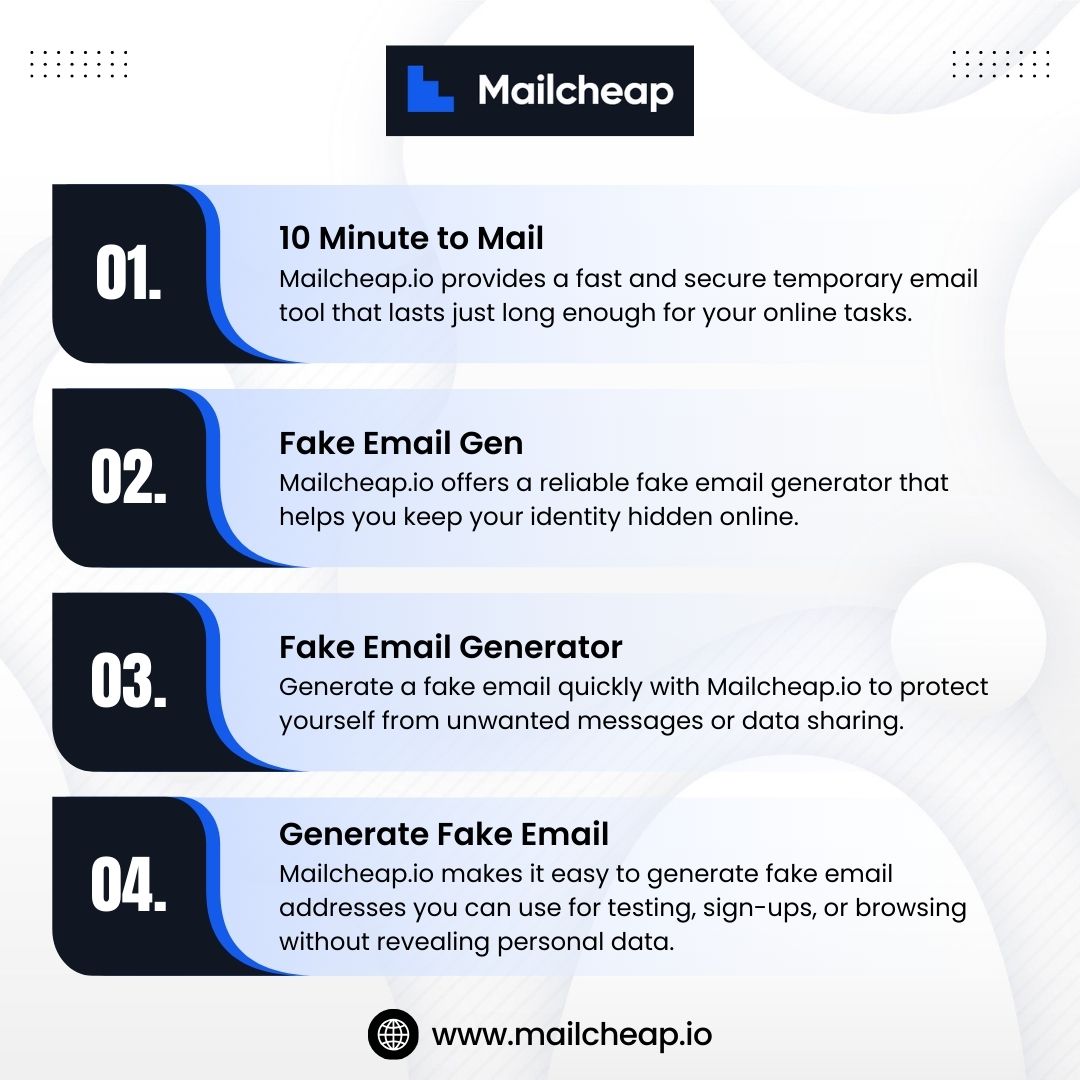 Mailcheap.io offers a reliable fake email generator that helps you keep your identity hidden online. Instantly create disposable inboxes for testing, sign-ups, or verification without exposing personal details. Our system is fast, secure, and perfect for avoiding spam or tracking while completing tasks that require an email.