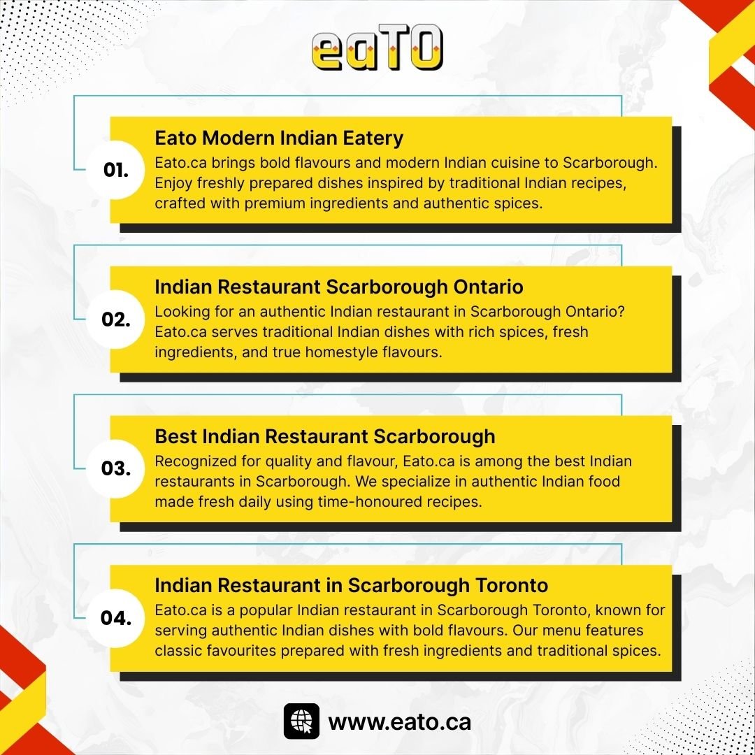 Eato.ca brings bold flavours and modern Indian cuisine to Scarborough. Enjoy freshly prepared dishes inspired by traditional Indian recipes, crafted with premium ingredients and authentic spices. From classic curries to street food favourites, Eato Modern Indian Eatery offers a warm dining experience, quick service, and rich taste that reflects true Indian culinary heritage in Ontario.