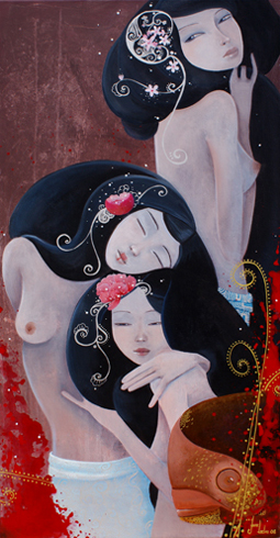 "June Leeloo es una joven y espléndida pintora e ilustradora francesa afincada en Nantes que encuentra la inspiración para sus obras en maestros de talla incuestionable como Gustav Klimt, Alfons Mucha, o Egon Schiele, pero también en la que en la obra de estos tres grandes geniosfascinación que ejerce sobre ella todo lo relacionado con el mundo oriental, y más concretamente, con Japón. Al igual , el tema principal representado por Leeloo, es la mujer, a la que dota de sensualidad y erotismo, en ocasiones con una cierta aureola maliciosa y lasciva, pero también de inocencia, serenidad y poesía."