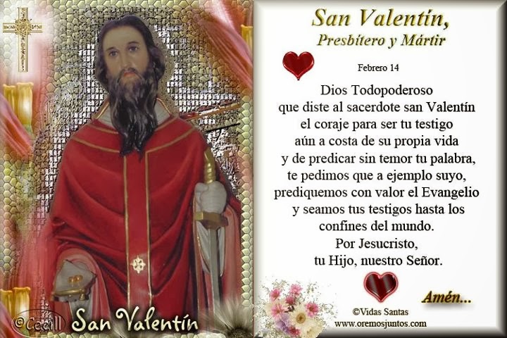 Patrono de los Enamorados Mártir en Roma a finales del siglo III. Entre el pueblo, el día de San Valentín está considerado como «día de la suerte», sobre todo en Alemania; y en Francia, Bélgica, Inglaterra y especialmente América, como «día de los enamorados», en que éstos se hacen promesas, felicitaciones y regalos. Esta costumbre y aquella supersticiosa idea, obedecen a diversos orígenes folklóricos y también al prestigio popular del Santo como milagrero. — Fiesta: 14 de febrero.