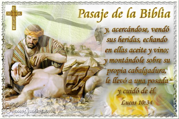 Evangelio según San Lucas 10,25-37. Un doctor de la Ley se levantó y le preguntó para ponerlo a prueba: "Maestro, ¿qué tengo que hacer para heredar la Vida eterna?". Jesús le preguntó a su vez: "¿Qué está escrito en la Ley? ¿Qué lees en ella?". El le respondió: "Amarás al Señor, tu Dios, con todo tu corazón, con toda tu alma, con todas tus fuerzas y con todo tu espíritu, y a tu prójimo como a ti mismo". "Has respondido exactamente, le dijo Jesús; obra así y alcanzarás la vida". Pero el doctor de la Ley, para justificar su intervención, le hizo esta pregunta: "¿Y quién es mi prójimo?". Jesús volvió a tomar la palabra y le respondió: "Un hombre bajaba de Jerusalén a Jericó y cayó en manos de unos ladrones, que lo despojaron de todo, lo hirieron y se fueron, dejándolo medio muerto. Casualmente bajaba por el mismo camino un sacerdote: lo vio y siguió de largo. También pasó por allí un levita: lo vio y siguió su camino. Pero un samaritano que viajaba por allí, al pasar junto a él, lo vio y se conmovió. Entonces se acercó y vendó sus heridas, cubriéndolas con aceite y vino; después lo puso sobre su propia montura, lo condujo a un albergue y se encargó de cuidarlo. Al día siguiente, sacó dos denarios y se los dio al dueño del albergue, diciéndole: 'Cuídalo, y lo que gastes de más, te lo pagaré al volver'. ¿Cuál de los tres te parece que se portó como prójimo del hombre asaltado por los ladrones?". "El que tuvo compasión de él", le respondió el doctor. Y Jesús le dijo: "Ve, y procede tú de la misma manera".