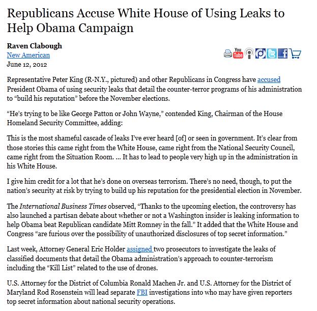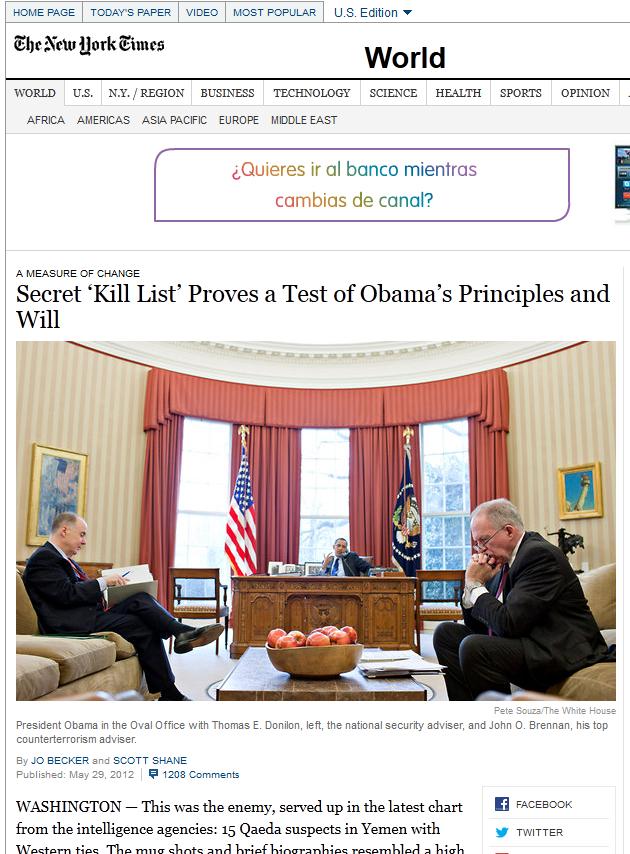 Debe Ud. conocer hoy que en éstos mismo momentos se viene llevando un intenso debate en el congreso de los EEUU. debido a las acusaciones al presidente Obama por parte de los Republicanos sobre la utilización de filtraciones de información para la campaña de reelección de Obama (clic para ver), ésto es importante debido a que hace muy poco "se filtró" la denominada "Kill List", lista secreta del presidente que faculta a la Casa Blanca a la utilización de DRONES (ojo DRONES) para matar gente que represente una amenaza directa para los EEUU. como terroristas etc. (clic para ver).