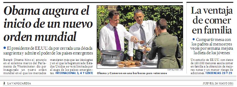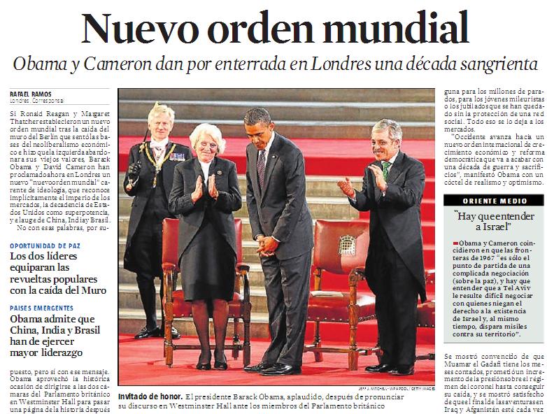 Esta nota publicada en "La Vanguardia" el jueves 26 de mayo de este año anda circulando por internet en varios sitios; la agenda sigue en curso para formalizar públicamente el tan mentado Nuevo Orden Mundial; bueno, seria "un mero formalismo" ya que desde hace muchos años atrás éste opera en las sombras; se espera ya "oficializarlo" ante los ojos del mundo y darle un nombre como dios manda al aborto (que ya lo tiene) por supuesto, a la cabeza Obama y Cameron.