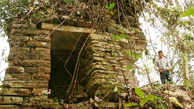 Una puerta que conduce al centro de un edifico maya nunca se ha abierto. Desde arriba de este lugar se pueden observar otros montículos cubiertos por árboles y vegetación. Pedro Ramírez asegura que se trata de otras pirámides.