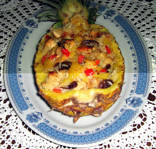 Abra o abacaxi ao meio e, com uma faca, retire a polpa do seu interior. Corte aos cubos e reserve a casca da fruta. Corte a carne aos cubos pequenos e tempere com sal e pimenta. Core no azeite e junte o pimento igualmente aos cubos, a cebola e os alhos picados. Refogue por mais alguns minutos e adicione o arroz. Envolva e regue com o caldo de galinha quente. Cozinhe por dez minutos. Acrescente os cubos do abacaxi que reservou, os frutos secos e envolva bem. Coloque o arroz dentro das metades do abacaxi e leve ao forno por dez minutos a 200 graus.